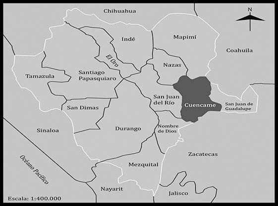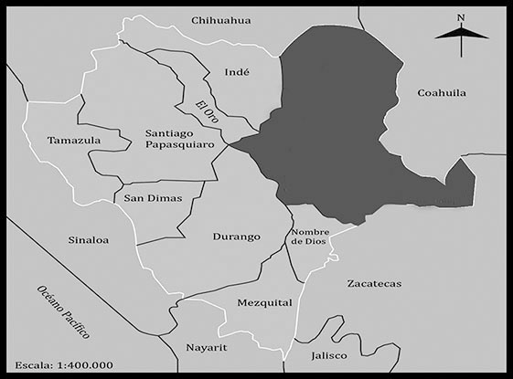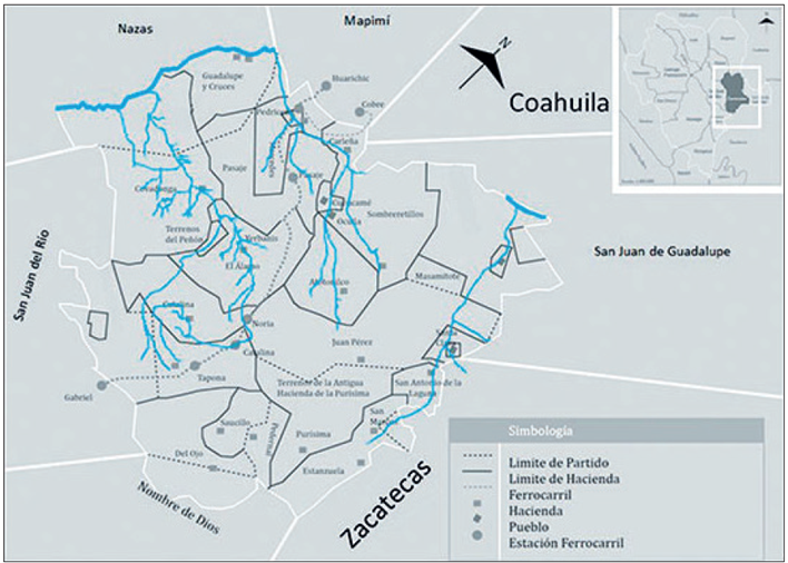 El oriente del actual estado de Durango, que se observa en el mapa 1 siempre ha sido una región desértica, donde el ser humano ha encontrado dificultades para establecerse. Los pueblos originarios eran nómadas que recorrían ese territorio en busca de los elementos de subsistencia. Después de la llegada de los españoles, en el contexto de la lucha contra los indios bárbaros, el mayor éxito de los primeros en términos de poblamiento fue la fundación de presidios y la creación de mayorazgos,1 de los cuales el más importante fue el de San Miguel de Aguayo establecido a finales del siglo XVII.2 Desde aquellos tiempos hasta las últimas décadas del siglo XIX no hubo un incremento considerable de la población,3 pero sí cambios importantes en relación con la configuración de la propiedad, ya que los presidios se convirtieron en pueblos y el mayorazgo se dividió en haciendas.