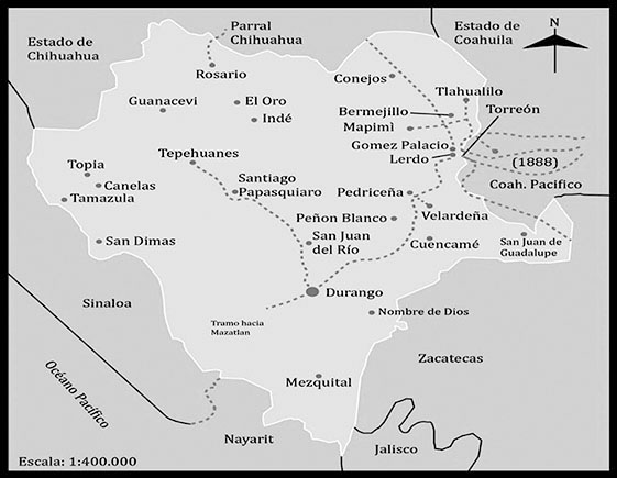 Un año después de que la Tlahualilo compró la hacienda de San Fernando, en 1892, el humo de las locomotoras anunció la llegada del Ferrocarril Internacional Mexicano a la ciudad de Durango, cuyo tendido de vías, como muestra el mapa 5, al unir la capital del estado con Torreón, atravesó el Partido de Cuencamé.20 Las empresas ferrocarrileras fueron reconocidas por los poderes locales como actores sociales importantes; tales compañías lejos de ser combatidas por los terratenientes establecieron una relación con ellos, la cual estuvo marcada por la mutua dependencia y complicidad, en donde los latifundistas buscaron sacar provecho de la nueva interconexión abierta por el ferrocarril.21 El quedar unidos a la Comarca Lagunera significaba tener vía libre, gracias a otros tramos de vía, al mercado estadounidense.