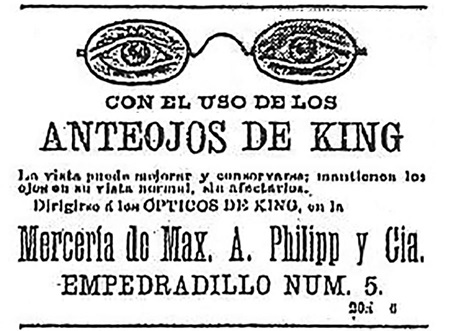 Específicamente respecto a la actividad mercantil de anteojos, éstos se ofrecían al público en Mercería de Calpini, cuyo costo fluctuaba entre 4 y 16 pesos,92 mientras que los ofertados en Ópticos de King, ubicados en la Mercería de Max A. Philipp, entre 2.95 y 25.00 pesos.93 Quizás esta diferencia se debiera a que en el primero se elaboraban las lentes, en tanto que en el segundo se importaba todo el anteojo (lentes y armazón en que se colocaban éstas) de Norteamérica, y también los de origen inglés y francés. El costo de los anteojos resultaba ser elevado, mucho más para empleadas domésticas y trabajadores del campo y en cierta forma para algunos sastres, carpinteros y forjadores, no así para supervisores de producción fabril y comercial de tabaco, ingenieros y administradores públicos que estarían en el rango más alto de sueldos registrados entre 1820 y 1884; se estima que sólo 30% de la población tenía trabajo de tiempo completo y seguro. Hay que considerar que 2% de la población era propietaria de su vivienda y que el pago de renta de local comercial o habitacional era considerable, asimismo el costo de alimentos y vestimenta fuera nueva o usada, aun de la mecanización de la producción de prendas de vestir.94 Por lo anterior la adquisición de anteojos, para mejorar algún déficit visual se restringía al sector reducido de la sociedad que poseía poder económico, instrucción escolar y actividad laboral.