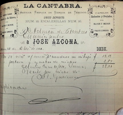 Tres localidades próximas a la ciudad ofertaban vidrio en sitios comerciales capitalinos. Una de ellas fue la antigua Fábrica de Vidrios de Texcoco “La Cantabra”95 (Figura 3), con local ubicado en la calle de Escalerillas núm. 16, que durante un tiempo estuvo a cargo de Latapi. Otro fue el Depósito de Vidrios Planos perteneciente a la Fábrica de Apipilhuasco de la misma entidad, situado en la calle del Ángel núm. 5.96 La Fábrica de Apizaco poseía un local para la venta de sus productos en la calle de Flamencos y Porta Coeli,97 y asimismo la Fábrica de San Antonio Calpulalpan arrendaba el almacén en el núm. 3 del ex Mercado del Volador,98 ambas del estado de Tlaxcala, y el depósito de la Fábrica de San Juan de los Llanos, de Puebla, ubicado en la calle de Santo Domingo núm. 6, para fines del siglo.99