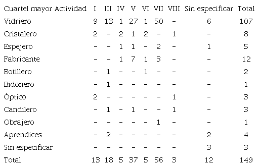 Los estudios realizados para reconocer las actividades laborales en la ciudad de México reportan que en 1842 existieron 118 064 habitantes; de ellos, 40% tuvieron oficio (hiladores, tejedores y sastres, zapateros, carpinteros, trabajadores de la construcción, elaboración de alimentos, orfebres de materiales preciosos, pintura y escultura, impresores y dedicados a la barbería y peluquería, procesadores del tabaco, cerámica, relojería y pólvora) o profesión liberal;38 sin embargo, la consulta del Padrón de la Municipalidad de México, del Archivo Histórico de la Ciudad de México, de los años de 1842, 1848 a 1850, 1863, 1886, 1873 a 1875, 1877 a 1879 y 188239 reveló la existencia de ciento cuarenta y nueve vidrieros, cifra reducida en comparación con otras actividades de manufactura. Su edad oscilaba entre 16 y 90 años, cuatro eran aprendices, de entre 10 y 14 años, la mayoría casados y originarios de la ciudad de México, aunque 14 oriundos de Puebla y 2 de Texcoco (estados con sitios de producción de vidrio). Diez de otras entidades y del resto se desconoce su procedencia. La cifra total pudiera ser mayor debido a que el censo de 1842 fue incompleto al faltar 17 manzanas por encuestar y a la circunstancia de 1863 comentada. Lo anterior contribuyó al subregistro de artesanos, al indicarle al trabajador que en el momento que fuera entrevistado por el encuestador censal no especificara su ocupación para evitar el gravamen tributario, o bien, el encuestador por iniciativa propia los registró como “artesano”, “obrador”, “operario” u “obrajero”. De igual forma pudo ser con los operarios del horno de vidrio, pues únicamente se anotó “hornero”, que quizás fuera de panadería u otra labor productiva. El Cuadro 1 muestra la actividad específica declarada por los artífices y la zona territorial de su morada.