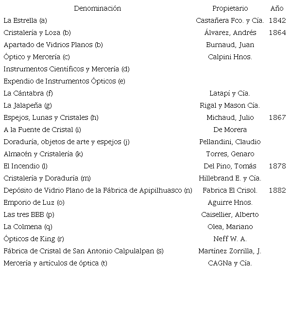 Con respecto a sitios comerciales, 18 pertenecían a una compañía o sociedad (conformada a lo más por tres miembros, fueran o no familiares), seis de origen extranjero (Francia, Alemania e Italia), tres nacionales (Calpulalpan y Apizaco, pertenecientes a Tlaxcala y Apipilhuasco en Texcoco).70 Los comercios de vidrio con un solo propietario fueron 33, 13 de nacionalidad extranjera (austriaca, francesa, inglesa y alemana), dos más que no fue posible reconocer la procedencia y 20 con apellido castellanizado que quizás fue española o nacional; 14 no especificaban la razón social del comercio, pero fueron registrados como tales en guías de forasteros. La diferencia entre el total de negocios reconocidos y el número de dueños estriba en que algunos tenían a su cargo varios sitios comerciales.