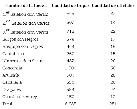 De esta manera se puede ver cómo en los últimos meses de 1823 todo parecía estar a favor de la causa realista en el Perú. Desde el Cuzco, el virrey La Serna controlaba el sur del Perú y el Alto Perú con una fuerza militar de 18 000 hombres divididos de la siguiente manera: 4 000 en la división de Olañeta; 3 000 en Puno y Arequipa, cuyas fuerzas componían el Ejército del Sur; 8 000 en el Norte; 1 000 en el Cuzco y los otros 2 000 en otras guarniciones. Las montoneras, por otro lado, también fueron fundamentales en el sur de Lima.56 Tal como sostiene Albi de la Cuesta, pese a tener la ventaja de que el grueso de estas fuerzas se encontrase en su “hábitat natural” y los años de guerra de sus principales jefes militares, al ejército realista le resultaba difícil el cubrir las bajas de los veteranos americanos y españoles.57