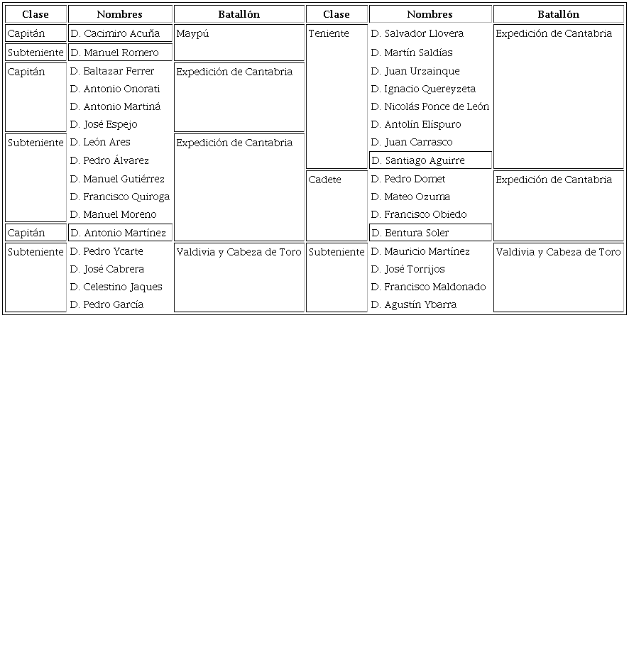 Esto explicaría por qué, en este contexto, en junio se entablaron negociaciones para el canje de prisioneros, el cual debía llevarse a cabo entre oficiales y respetando las solicitudes planteadas. De esta manera, por el capitán chileno don Blas Mardones se debía de entregar al capitán realista don Manuel Michel “y por su fallecimiento y otra causa, el capitán don Antonio Onorati”; por el teniente graduado de capitán don José Ignacio Plaza, el teniente graduado de capitán don Damián Calleyro “y en su defecto el teniente graduado de capitán don Martín Saldías”; y por el subteniente don Juan Feliz Vargas, el subteniente don Eugenio Moreno “y en su defecto el subteniente don León Artes”.68 El nombre de otros oficiales chilenos, también prisioneros en el Callao, se puede ver en el cuadro 2.
