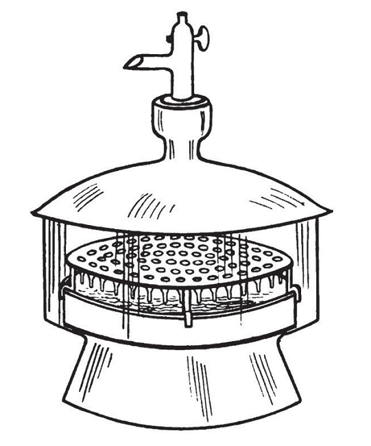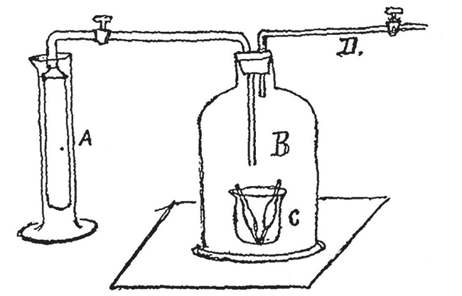 Si se deseaba esterilizar y llenar ampolletas de forma rápida, cómoda y económica, se realizaba mediante vacío con el famoso aparato de Eury (figura 5), de uso frecuente en diversos países. Este aparato consistía en una probeta de pie (A), que llevaba en su interior una bujía Pasteur, la cual se conectaba por medio de un tubo de caucho y otro de cristal a una campana (B) que cubría un recipiente (C) con las ampolletas requeridas. Para trabajar con las ampolletas, éstas tenían que estar previamente cerradas por un lado. De la parte superior de la campana salía otro tubo (D) que comunicaba con una bomba neumática o una trompa de agua para vacío. El procedimiento era el siguiente: se ponía el líquido en la probeta y se iniciaba el vacío, con lo cual el líquido empezaba a caer en el recipiente interior. El aire de las ampolletas salía y cuando se dejaba entrar de nuevo el aire, éstas se llenaban por sí solas, cerrándolas después a la lámpara.73