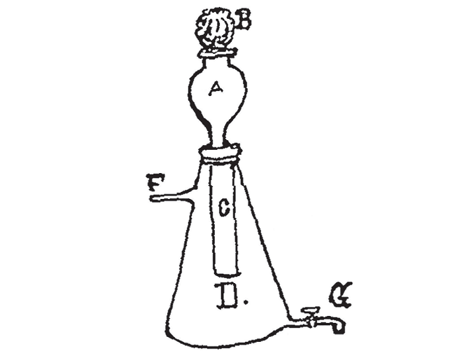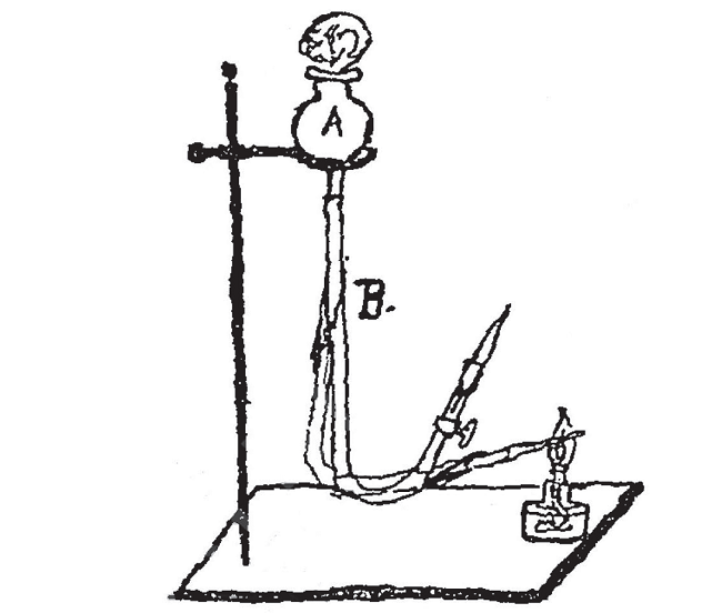 [… ]un vaso de bohemia (vaso de precipitado) el cual se llena del líquido, se ponen allí las ampolletas cerradas por un lado, se calienta por medio de una lámpara hasta llegar a la ebullición, se deja enfriar y las ampolletas se irán llenando a medida que se vaya enfriando el líquido; esto está fundado en que el aire es expulsado, en este caso, por medio de calor y en el otro (el método de Eury), por medio del vacío.74