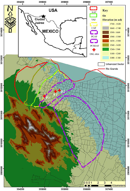 Figure 1 shows a Digital Elevation Model (DEM) of the study area with the distribution of alluvial fans derived from the Juárez Mountains. OSL ages were obtained from the CAF (Figure 2). At least five shifts of the Río Bravo tributaries occurred during Pleistocene to Holocene time, providing these possible scenarios: i) the Cabeza de Vaca Lake of Plio-Pleistocene time (> 2.5 Ma) (Strain, 1966; Hawley and Kottlowsky, 1969; Vanderhill, 1986; Gustavson, 1991); ii) the ancestral Río Bravo path changed again during the Middle to Late Pleistocene (0.66 Ma to 0.16 Ma); iii) the older Río Bravo tributaries built a dissected terrace during Late Pleistocene time (0.16 to 0.10 Ma) (Connell et al., 1998); iv) another terrace system was formed during Late Pleistocene time from 78 to 28 ka (Connell et al. , 1998) and again from 15 to 22 ka (Hawley and Kottlowsky 1969; Hawley et al. , 1976; Allen and Anderson, 1993). During this period of time, younger Río Bravo tributaries were active again. Finally, v) from 15 ka to the present, the last shift of the Río Bravo has been in progress. Connell and Love (2001) described a series of late Quaternary sands and gravels deposited above the Santa Fe Group (making them Post-Santa Fe Group sediments). These form a series of river terraces adjacent to the modern Río Grande in New México. Of interest to our study, the upper terraces (informal depositional units Qra and Qay of Connell and Love (2001)) are approximately age-equivalent to the dates that we have obtained from the alluvial fans above the Ciudad Juárez (see Figures 3 and 6 of Connell and Love, 2001) noting that these authors did not provide numerical ages).