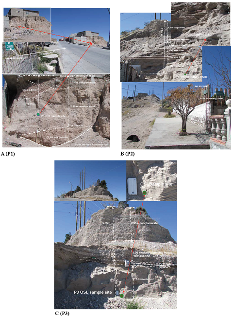 As noted above, a key problem in fan analysis is that the system has been dissected and extensively covered by the modern development of Ciudad Juárez. Determining detailed geometric relationships between the various parts of the fans is effectively impossible. However, it is expected that the uppermost exposed deposits at any site will provide the best opportunity to assemble age data for more recent fan evolution. Consistency of the material was achieved by sampling of aeolian sands at all the three sites. In each outcrop location, the local stratigraphy shows that the sands sampled for OSL dating are overlain by conglomerates (see Figures 3A-C) so episodes of aeolian deposition were followed by renewed fan building activity. The three sample sites help to constrain the overall general history of the alluvial fans but are specifically tied to the CAF, which was selected in order to understand the most recent history of the fan system. Therefore, aeolian layers should be the best candidates for a complete bleaching during the depositional processes and would function as proxies for arid or windy period. Samples were collected at the following sites on the CAF (see Figure 2):