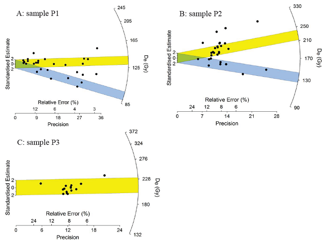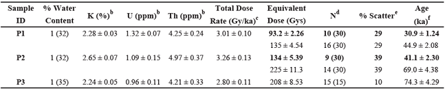 The sample with the tightest equivalent dose distribution was P3 (Table 1). However, P3 is also the oldest sample and came very close to having all quartz OSL trap sites completely filled (usually quartz saturates around 150 - 200 Grays in traditional OSL measurements; Mahan et al., 2015). The two younger samples were not saturated for two reasons: firstly, because the growth curves (see Figures 4A, 4B, 5A and 5B and table 5 of supplementary material) did not exhibit saturation behavior and secondly because the dose rate was moderate enough (2.80 to 3.26 Gy/ka) to allow natural accumulation to occur for some length of time (Table 1). The quartz in sample P3 was approaching to saturation at 208 Grays, so this age could be even older, but is certainly not younger than 74 ka (Figure 6B of supplementary material). P1 and P2 have two equivalent dose populations with correspondingly higher dispersions, close to or over 30 % to 40 % (P1 = 29 % and P2 = 39 %; (see Table 1).