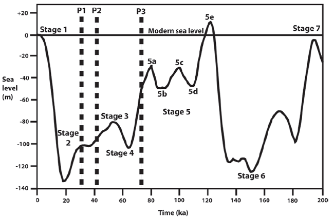 The results coincide with the period of time covering Oxygen Isotope Stages (OIS) 3 to 5 as follows: samples P1 was measured at 30 and 45 ka (late OIS Stage 3), samples P2 was measured at 41 and 69 ka (around the boundary between OIS 4 and 3), and sample P3 was measured at 74 ka (very latest OIS 5a). These ages represent deposition during both glacial and interglacial phases.