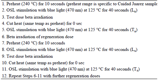 Fan distribution was studied and mapped using a combination of field observations and GIS-based topographic mapping, with the caveat that comprehensive fieldwork in the Ciudad Juárez area is precluded by the large-scale ground coverage of buildings and roads. Mapping was used to determine the most appropriate locations for OSL sediment sampling (Personius and Mahan, 2000, 2003; Nelson et al., 2015). OSL was applied to samples collected from three specific sites mostly composed of fine aeolian quartz sands (see Figures 3A-C). The samples were collected by the first author using the procedure recommended in Cole et al. (2007). Care was taken to keep the samples light-tight during collection and shipment to the OSL laboratory. The samples were processed using protocols set forth in Gray et al. (2015). We used the 250 - 180 µm fraction because this one yielded the largest amount of quartz particles useable of the sample. However, even using this largest fraction of quartz, we were limited in the number of aliquots available for analysis due to small quartz yields in the lab. Samples were treated to standard HCl, H2O2, and HF treatments, magnetic and density separation, and dose rates were measured using gamma spectrometry at the U.S. Geological Survey TRIGA facility (Gray et al. , 2015) cosmic ray contribution to dose rate for luminescence was achieved using the method of Prescott and Hutton (1994).