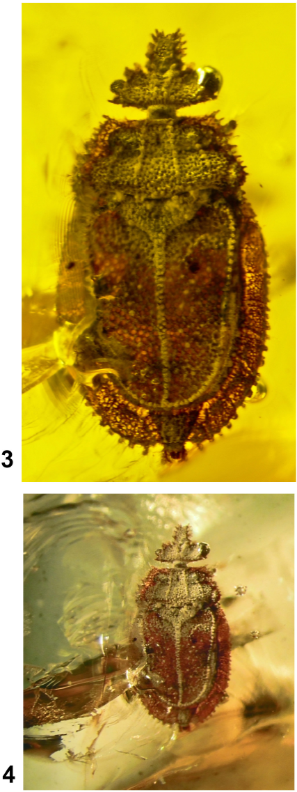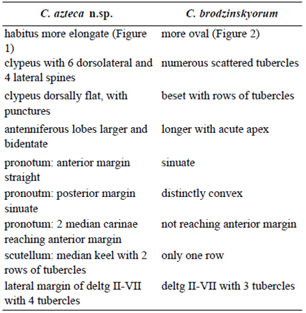 The only fossil representative of the extant Calisiinae genus Calisiopsis (Champion, 1898) is C. brodzinskyorum (Froeschner, 1992) described from contemporaneous Dominican amber (Figure2). Comparison of C. azteca n.sp. with the original description and the illustration (Figure 4) of C. brodzinskyorum shows following differences: