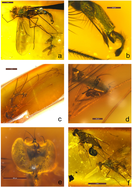 Remarks.Amblypsilopus is a rich and complex pantropical genus. Adults of many species can sometimes be found resting on tree trunks. In addition to the new species below based on the only male, some seven inclusions were found with females only (e.g. , Fig. 1f). The genus is discussed extensively in Bickel (1994).