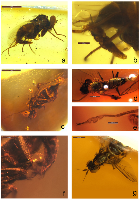This subfamily includes many genera that characteristically associated with tree trunks, making them likely to become entrapped in tree resin flows, later to become amber inclusions. Apart from the species-rich genus Medetera , Mexican amber also has a representative of the genus Systenus Loew (see Fig. 2g), whose larvae are known to inhabit moist tree holes.