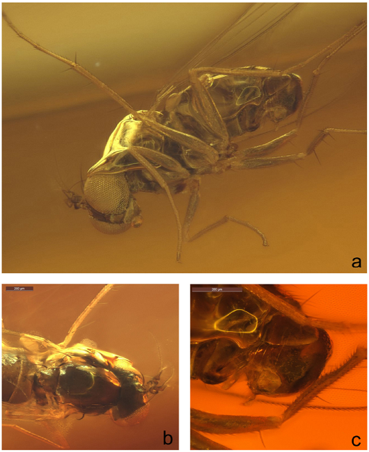 Type material. Amber specimen from Simojovel, Chiapas, Mexico. Holotype, ♂, #B-8425-151, Figs 3a-c) (UCMP).