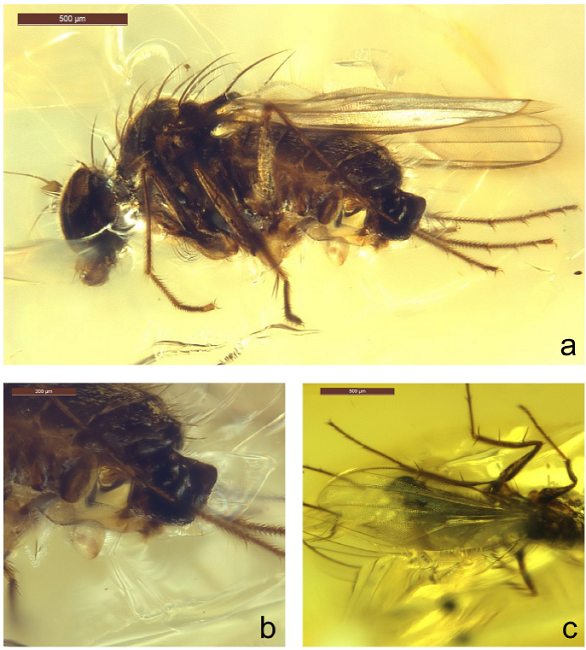 The Dolichopodidae (long-legged flies) are one of the largest families within the order Diptera, and comprise more than 7500 described species in some 200 genera. In Central America more than 400 species are already reported (Bickel, 2009). Dolichopodidae are often abundant in warm mesic habitats. The family is common in Cenozoic amber inclusions, primarily because adults of many genera live on tree trunks where they both hunt for small arthropod prey and search for mates. This behavior makes them likely to become entrapped in sticky resin flows, and ultimately included in amber.