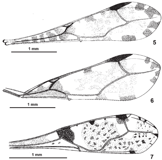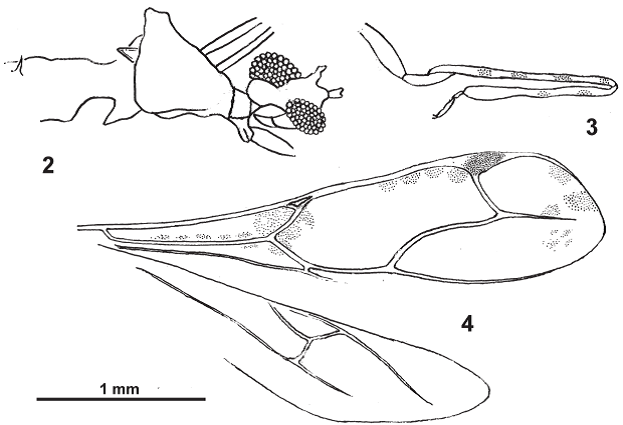 Wings - Fore wing apically rounded, 3.6 times as long as wide; pattern and venation as in Figure 2; distance from apex of pterostigma to tip of wing 2.5 x as long as distance from apex of pterostigma to insertion of M; discal cell 2.8 x as long as its maximum width, apical portion clearly pointed; independent basal part of anterior border of discal cell as long as 1/3rdof its fused part with anterior margin of wing. Venation of hind wing complete; M-Cu very long (Figure 4).