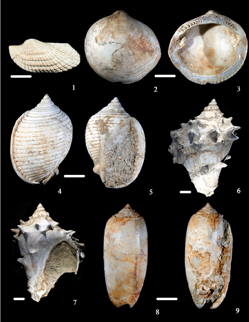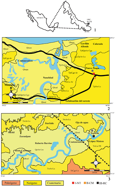 Se visitaron tres localidades en el estado de Veracruz (Figura 1.1): I-Nuevo Teapa (I-NT), en un corte sobre la Carretera Federal 180, cerca del poblado de Nuevo Teapa, al este de Nanchital; II-Córdoba-Minatitlán (II-CM), en la intersección de las carreteras Córdoba-Minatitlán y Coatzacoalcos-Cárdenas, al sureste de Nuevo Teapa y al norte de Ixtlahuatlán del Sur (Figura 1.2). En la localidad I predomina la arenisca café y rojiza, mientras que en la localidad II aflora lutita de color negro. La tercera localidad se denominó III-Río Coatzacoalcos (III-RC), al margen del río con el mismo nombre, en el municipio de Jesús Carranza, cerca del poblado El Tepache, al sur de Ojo de Agua y al norte de López Mateos, a 29.7 km de la cabecera municipal (Figura 1.3). En esta localidad predomina arenisca, lutita y limolita de color gris claro. Cerca de la localidad la litología que predomina son la lutita, la toba riolítica y la arenisca con limolita. Aunque en las tres localidades la presencia de moluscos fósiles es frecuente (Figura 2), en este trabajo nos enfocaremos en los datos proporcionados por microfósiles y datación isotópica. Los ejemplares de moluscos están depositados en la colección del Museo de Paleontología de la Facultad de Ciencias, Universidad Nacional Autónoma de México, bajo el acrónimo FCMP.