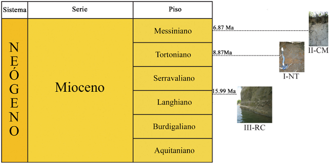 Con base en las edades obtenidas en millones de años y a partir del cuadro cronoestratigráfico de 2015 de la Comisión Internacional de Estratigrafía (Cohen et al., 2013; updated ), se establecen las edades en las que se depositó la Formación Agueguexquite. La localidad III-RC (muestra RC2602II) corresponde al Burdigaliano-Langhiano (15.99 + 0.78 / - 1.31 Ma) (Mioceno temprano-medio), mientras que las localidades I-NT (muestra NT2502II) y II-CM (muestra CM2502II), corresponden al Tortoniano (8.87 + 1.77 / - 2.26 Ma) y Messiniano (6.87 + 2.16 / - 0.88 Ma), respectivamente (Mioceno tardío). Por lo anterior se asume que las localidades estudiadas de la Formación Agueguexquite corresponden del Mioceno Medio al Mioceno Superior (Burdigaliano-Messiniano) (Figura 5).