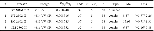 Las muestras para la estratigrafía isotópica se obtuvieron a partir de conchas de moluscos (bivalvos y gasterópodos) de cada localidad (I-NT, II-CM y III-RC), las cuales fueron molidas y etiquetadas para posteriormente ser fechadas (datación relativa en comparación con la curva del agua del mar) con la técnica 87Sr/86Sr en el Laboratorio Universitario de Geoquímica Isotópica (LUGIS) del Instituto de Geofísica, Universidad Nacional Autónoma de México. Los análisis isotópicos se realizaron con un espectrómetro de masas con fuente iónica térmica marca THERMO SCIENTIFIC modelo TRITON PLUS. El espectrómetro cuenta con 9 colectores Faraday ajustables y todas las mediciones se hicieron de manera estática. Las muestras de estroncio (Sr) se cargaron como cloruros y se midieron como iones metálicos. Se analizaron 60 relaciones isotópicas (n) para Sr. Los errores (1sd = ±1σabs; 2 SE(M) = 2σabs /raíz n) durante la medición se refieren en los últimos dos dígitos. Todas las relaciones isotópicas de Sr se corrigieron por fraccionamiento de masas vía normalización a 86Sr/87Sr = 0.1194. Los valores del LUGIS para el estándar NBS 987 (Sr): 87Sr/86Sr = 0.710239 ± 12 (±1σabs, n = 18) (Tabla 1). Las edades relativas se obtuvieron con el programa LOWESS (versión 3) de McArthur et al. (2001).