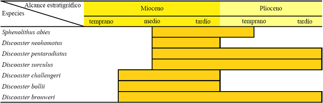 La edad de la microfauna se ubicó a partir de las especies Sphenolithus abies "A", Sphenolithus abies "B", Discoaster challengeri, Discoaster bollii y Discoaster brouweri (Figura 4) como parte superior del Mioceno Medio.