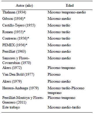 Considerando los registros de la Tabla 2, se puede observar que las edades que han asignado previamente para la Formación Agueguexquite van del Mioceno temprano al Plioceno medio y, a pesar del desacuerdo que aún existe, se puede ver que los resultados obtenidos en este trabajo coinciden con la datación realizada por Gibson (1936), Castillo-Tejero (1955), Romen (1955), Contreras (1956), PEMEX (1956), Perrilliat (1963) y Sansores y Flores-Covarrubias (1972); también coincide con la edad propuesta por Herrera-Anduaga (1979). Por otra parte, existen otros reportes como los de Bold (1978), Akers (1972; 1979), Perrilliat y Flores-Guerrero (2011) que ubican a la formación en el Plioceno temprano y Plioceno medio.