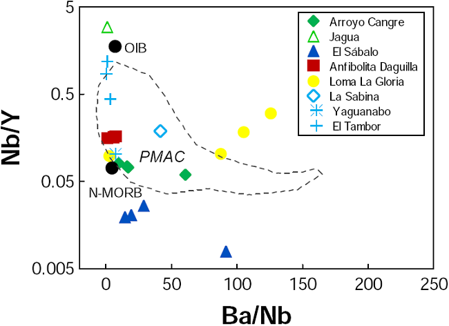 Por otra parte, una serie de diagramas de variación, que involucran elementos mayores y traza, se utilizaron para inferir la afinidad tectónica de las litologías bajo estudio. Estos diagramas incluyeron, para efectos de comparación, campos obtenidos de rocas de la PMAC. Por ejemplo, en el diagrama Nb/Y - Ba/Nb (Figura 10), la mayor parte de las rocas de los dominios D2 y D3 presentan composiciones que asemejan a las tipo N-MORB. El desplazamiento de algunas litologías de La Sabina, Arroyo Cangre y Loma La Gloria, hacia valores de Ba/Nb > 40, pudiera estar asociado a procesos de asimilación de sedimentos. Por otra parte, las muestras del dominio D1 se distribuyen en un arreglo lineal (con una relación Ba/Nb aproximadamente constante) entre las composiciones tipo MORB y OIB, lo que reflejaría variaciones de enriquecimiento de elementos incompatibles en la fuente de Manto (tipo E-MORB) o de las condiciones en las que ocurre la fusión parcial, tendencia también observada para las rocas del PMAC (Figura 10).