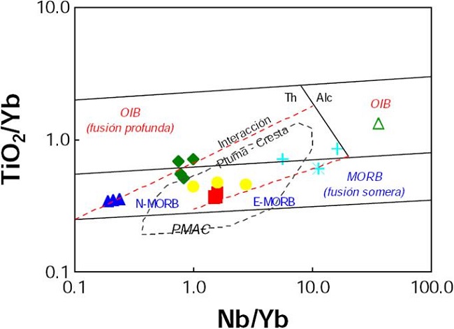 En el espacio Th/Yb - Nb/Yb (Figura 11), las muestras bajo estudio se distribuyen a través del arreglo lineal tipo N-MORB/E-MORB/OIB. Las muestras incluidas en el dominio D1 se caracterizan por mostrar relaciones Nb/Yb > 4 y Th/Yb > 0.5 que son comparables a las observadas en E-MORB. El metabasalto de Jagua Jg-1 se proyecta hacia la región de una fuente mantélica más enriquecida tipo OIB. Por su parte, las muestras de los dominios D2 y D3 se asemejan a N-MORB, con relaciones Nb/Yb ≤ 4 y Th/Yb < 0.5. La naturaleza toleítica (Nb/Yb < 20) de las rocas y su asociación a características parecidas a N-MORB o E-MORB (TiO2/Yb < 1), con excepción de la muestra Jg-1 (Jagua), también fue confirmado en el diagrama TiO2/Yb - Nb/Yb (Figura 12). En ambas figuras, existe una similitud entre las litologías estudiadas y los campos que marcan las rocas de la PMAC. Por otra parte, Marzoli et al., (1999) y McHone (2000) han reportado que la mayor parte de este evento magmático consiste de basaltos toleíticos de %SiO2 = 46 - 49 y TiO2 < 2 %, y con enriquecimientos moderados a marcados en lantánidos ligeros con respecto a pesados. Su origen se ha asociado a varias celdas de convección que actuaron bajo un ambiente de rift que fue evolucionando a una cresta oceánica. Cabe aclarar que, aunque las muestras de la Formación El Sábalo se ubican fuera del campo PMAC, presentan características geoquímicas similares (%SiO2 = 48.2 - 50.0 y TiO2 = 1.04 - 1.13 %; Allibon et al., 2008). Finalmente, la aplicación de un diagrama de discriminación tectónica de funciones multi-dimensionales (Figura 13), consistentes del logaritmo de relaciones de elementos mayores (Verma et al., 2006), confirmó características tipo MORB para la mayor parte de las muestras bajo estudio (con un 99 % de nivel confianza). Como se observó en otros diagramas de variación, algunas muestras del dominio D1 (especialmente Jagua) muestran una afinidad similar a una fuente de tipo OIB, que en este caso podría considerarse comparable a E-MORB.