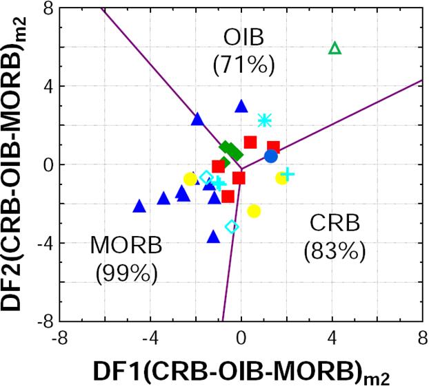 Verma, S.P., Guevara, M., Agrawal, S., 2006, Discriminating four tectonic settings: Five new geochemical diagrams for basic and ultrabasic volcanic rocks based on log-ratio transformation of major-element data: Journal of Earth System Sciences 115, 485-528.