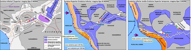 Durante el proceso de rompimiento de Pangea, en los márgenes de Yucatán (Maya), Chortis y América del Sur, se dieron condiciones para el desarrollo de una intensa actividad magmática. En el caso del occidente y centro de Cuba, este magmatismo se asoció con secuencias siliciclásticas y carbonatadas, que constituyeron un Margen Continental Pasivo vinculado al Bloque Maya.