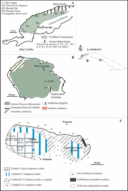 La Cordillera de Guaniguanico (Figuras 2A y 3) está constituida por un apilamiento de mantos de sobrecorrimiento que se desarrolló durante el Paleoceno-Eoceno Medio (Piotrowski, 1987; Bralower e Iturralde-Vinent, 1997). De acuerdo a la posición geográfica y a la secuencia de litologías, se han identificado las siguientes unidades tectono-estratigráficas: Faja Cangre, Los órganos, Rosario Sur, Rosario Norte y Quiñones-Guajaibón (Iturralde-Vinent, 1998; Pszczolkowski, 1999; Figura 2A). Las secciones estratigráficas se inician con sedimentos siliciclásticos de las formaciones San Cayetano y Arroyo Cangre (Pszczolkowski, 1999, Figura 3). éstos son cubiertos por rocas marinas calcáreas con intercalaciones de estratos siliciclásticos, correspondientes a las formaciones Jagua, Francisco, Guasasa (parte baja), Artemisa (parte baja) y El Sábalo, y por rocas marinas calcáreas y silíceas de agua más profunda, representadas por las formaciones Guasasa (parte alta), Artemisa (parte alta), Polier, Lucas, Pons, Santa Teresa, Carmita, Pinalilla, Peñas y Moreno (Figura 3). Se ha reportado que las unidades Faja Cangre, Rosario Norte y Sur incluyen rocas ígneas (Tabla 1). Sin embargo, sólo en Faja Cangre existe evidencia de metamorfismo de baja T y alta P (Millán, 1972; Cruz-Gámez et al., 2007), ubicado en el Cretácico Superior (parte alta) (García-Casco et al., 2008).