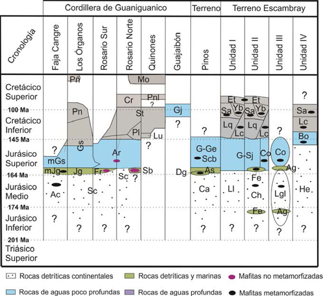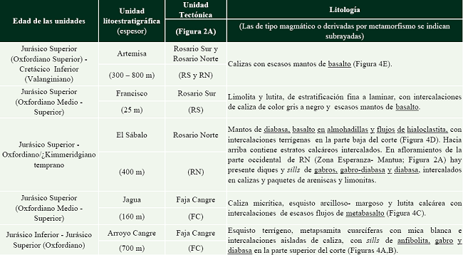 Las secciones en esta región contienen rocas magmáticas dentro de las unidades tectónicas Faja Cangre y Rosario Sur y Norte, que cubren el intervalo Jurásico Inferior?-Cretácico Inferior (Pszczolkowski, 1999; Tabla 1; Figura 3).