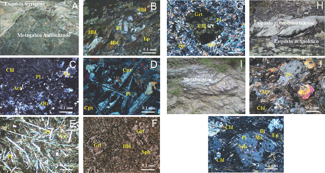 En la Formación La Sabina (Cretácico Inferior/Aptiano - Cretácico Superior/Turoniano) se reconocen, en la localidad La Sierrita (provincia de Cienfuegos), esquistos verdes metavolcánicos de textura nematoblástica compuestos por actinolita, clorita, epidota, albita ± talco (Tabla 4). A veces conservan la fábrica magmática primaria y relictos de clinopiroxeno y plagioclasa (espesor ~2 m). éstos ocurren dentro de una sucesión de cuarcita y metasilicita bien estratificada y bandeada, con frecuencia granatíferas, con intercalaciones de mármol gris y metapsamita (Millán, 1997c; Tabla 3, Figura 4H). En el Valle de Yaguanabo (Cúpula de Trinidad), la Formación Yaguanabo (Cretácico Inferior - Cretácico Superior) incluye metavulcanitas básicas (hasta 4.5 m, se repiten en el corte; Figura 4I) en facies de esquistos verdes, acompañados de mármol y cuarcita (Millán, 1997c; Tabla 3). éstos corresponden a esquisto feldespático, con textura pórfido-lepidoblástica, y que incluyen plagioclasa, epidota, actinolita y clorita (Figura 4J). En ocasiones se reporta la presencia de esquisto actinolítico talcoso, con antigorita y hornblenda relíctica escasa, de textura lepidoblástica, posiblemente derivados de un protolito ultramáfico (Stanik et al., 1981; Dublan et al., 1986; Despaigne-Díaz, 2009). La Formación Yaguanabo constituye una sucesión de esquistos verdes con textura-estructura primaria, conformados de metatoba, metatufita, metaglomerado y metalava porfírica (Stanik et al. , 1981; Dublan et al. , 1986; Millán y Somín, 1985a). La Formación El Tambor (Cretácico Superior por su posición estratigráfica, Figura 3) al E del poblado San Blas (carretera La Sierrita-Topes de Collantes) presenta esquistos verdes metavolcánicos con albita, actinolita, clorita, mica, biotita, epidota y esfena (espesor ~2.5 m; Figura 4K), intercalados por esquistos cuyo protolito son sedimentos de tipo flysch (en facies de esquisto verde) y, en ocasiones, por mármol y metasilicita (Millán y Somín, 1985a; Tabla 3).