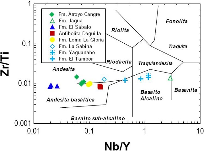 Se preparó una base de datos con la información generada, la cual se complementó con 12 muestras adicionales, cuya composición está disponible en trabajos previos (Cobiella-Reguera, 1996 [muestras: 8, 9, 10 y 11; Zona Esperanza, W de Rosario Norte]; Kerr et al., 1999 [muestra SAB1; Soroa, Formación El Sábalo]; Stanik et al., 1981 [muestra M-1; Unidad I, Cúpula de Trinidad, Formación La Sabina]; Schneider et al., 2004 [muestras: CU16 y LV66; Unidad III, Cúpula Sancti Spíritu, Formación Loma La Gloria]; González y Meriño, 2005 [muestra AD-1- Loma Daguilla]; Allibon et al., 2008 [muestras: Cu03-13, Cu03-14, Cu03-15; Soroa, Formación El Sábalo]). Dado el carácter alterado-metamorfizado de las muestras, se utilizó el diagrama Zr/Ti-Nb/Y (Winchester y Floyd, 1977; Pearce, 1996) para clasificar las rocas. Por otra parte, las muestras se graficaron en un diagrama Al2O3*-CaO*-FeO* molar o ACF calculado mediante proyección desde fases vectores de intercambio apropiados utilizando el software CSpace (Torres-Roldán et al., 2000), a fin de evaluar los potenciales efectos de la asimilación de sedimentos, alteración pre-metamórfica y metasomatismo en las muestras estudiadas.