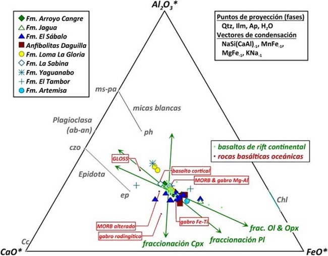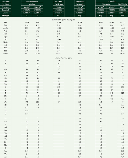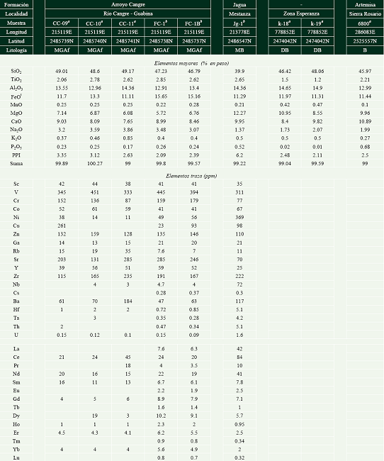 Allibon et al. (2008) indicaron que el magmatismo presente en la Formación El Sábalo (Jurásico Superior - Oxfordiano/Kimmerigiano temprano?; según Pszczolkowski, 1999) ocurrió durante la separación del bloque Maya y América del Sur. Aunque existen diversos reportes sobre este magmatismo de Margen Continental y sus equivalentes metamorfizados en las secciones del mesozoico cubano (Piotrowski, 1977, 1987; Pszczolkowski y Albear, 1983; Segura-Soto et al., 1985; Dublan et al., 1986; Piotrowski, 1987; Iturralde-Vinent, 1988a,b, 1996; Pszczolkowski, 1989; Cobiella-Reguera, 1996; Linares, 1997; Kerr et al., 1999; Schneider et al., 2004; Allibon et al. , 2008; Iturralde-Vinent, 2012), la información petrográfica y geoquímica aún es limitada para algunas localidades y, en otros casos aunque ha sido analizada integralmente (e.g. , Iturralde-Vinent, 1988b, 1996), los datos geoquímicos existentes son escasos y, en general, sólo se utilizan elementos mayores.
