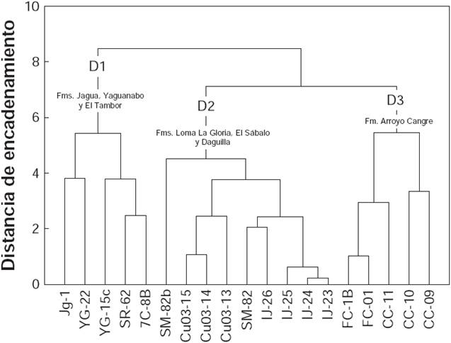 Dada la diversidad en litología y grado de metamorfismo observada en las rocas bajo estudio, se realizó un análisis jerárquico de agrupamiento (Hierarchical cluster analysis ; Bratchell, 1989), con la finalidad de identificar estadísticamente dominios de rocas con una similitud geoquímica. El análisis se llevó a cabo considerando el logaritmo de relaciones de elementos mayores (SiO2, TiO2, FeO, Fe2O3 y MgO; en % peso normalizados a análisis anhidro) y traza (lantánidos: Ce y Nd, litófilos: Ba y Sr, alta carga electrostática: Y, Zr y Nb, transición: Ni; en ppm) a Al2O3(en % peso normalizado). Este último elemento se consideró como denominador común en las relaciones, debido a su carácter relativamente inmóvil ante la alteración y el metamorfismo (Rollinson, 1993). De acuerdo a la disponibilidad de datos geoquímicos, en esta evaluación se consideraron muestras de las secuencias Arroyo Cangre, Jagua, El Sábalo, Anfibolita Daguilla, Loma La Gloria, Yaguanabo y El Tambor. Antes de efectuar el análisis, los logaritmos de las relaciones geoquímicas fueron estandarizados y el proceso iterativo de encadenamiento de las muestras siguió la regla de Ward (1963). Los resultados del análisis se utilizaron para generar un dendograma en valores euclideanos. Para mayor detalle del procedimiento estadístico consultar a Velasco-Tapia (2014).