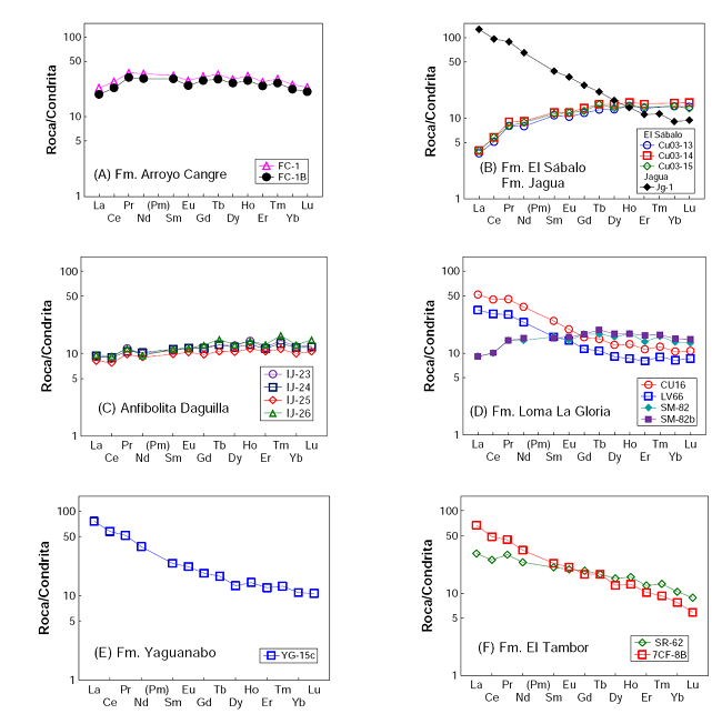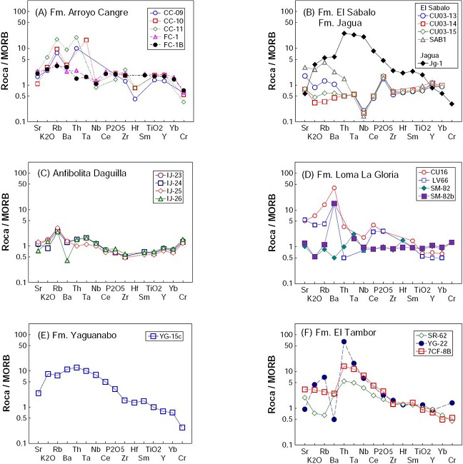 De acuerdo a los diagramas normalizados (Figuras 8-9) y de variación (Figuras 10-13), la mayor parte de las muestras de los dominios D2 (formaciones Loma La Gloria, El Sábalo y Anfibolitas Daguilla) y D3 (Formación Arroyo Cangre), así como la Formación La Sabina (por su ubicación en las Figuras 6 y 10 con algunas rocas de estos dominios), presentan características semejantes a N-MORB y se asemejan a la geoquímica que caracteriza a las rocas de la PMAC, magma generado durante el desarrollo de la corteza oceánica proto-Caribe (Figura 14). Cabe señalar que algunas relaciones índice de elementos traza, por ejemplo, Dy/Yb < 2.0 (con excepción de CC-10) o la relación TiO2/Yb < 1.0 también confirman la importancia de un proceso de fusión de una fuente somera de Manto (~60 km), la cual se podría haber fundido hasta en un ~20 % (Pearce, 2014). Las relaciones isotópicas de 143Nd/144Nd para las diabasas El Sábalo (Allibon et al., 2008) corresponden a un Manto empobrecido. Las desviaciones en composición geoquímica observadas en las rocas D2 y D3 , con respecto a MORB, podrían estar relacionadas a la asimilación de material siliciclástico, alteración superficial y evolución metamórfica de las correspondientes a los terrenos Pinos y Escambray (Figura 6). Además, se ha reportado que la alteración marina a baja temperatura (< 50°C) o un metamorfismo en facies de esquistos verdes del MORB puede dar lugar a la movilidad de elementos litófilos (Cs, Rb, Ba; Jochum y Verma, 1996). En el caso particular de la Formación Loma La Gloria, la actividad se inició como E-MORB (como se señaló en el dominio D1 ), pero con la evolución del margen esta secuencia siliciclástica fue penetrada, en esta etapa, por N-MORB. Por una posición estratigráfica comparable con la Formación Loma La Gloria, esta hipótesis también podría ser aplicable para el caso de la Formación Arroyo Cangre (Figura 3).