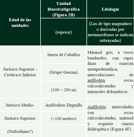 Esquistos verdes de protolitos volcánicos (con intercalaciones rítmicas de 30 cm), se han reportado en la Formación La Chispa (Cúpula de Trinidad; Jurásico Inferior a Superior/Oxfordiano), que incluye además esquisto cuarzo-moscovítico y filita moscovítica- grafítica, con intercalaciones de esquisto calcáreo y cuarcita (Stanik et al., 1981; Millán y Somin, 1985b; Tabla 3). En esta formación también aparecen otras metavulcanitas básicas (esquistos verdes con lawsonita y piroxeno; Millán y Somin, 1985b), denominadas "Esquistos Verdes Felicidad" (Jurásico Inferior a Superior). Se presentan con espesores que pueden alcanzar desde decenas hasta un centenar de metros, intercalados con capas de mármol negro o gris, esquistos metaterrígenos y cuarcita (Iturralde-Vinent, 1996; Figura 3, Tabla 3).