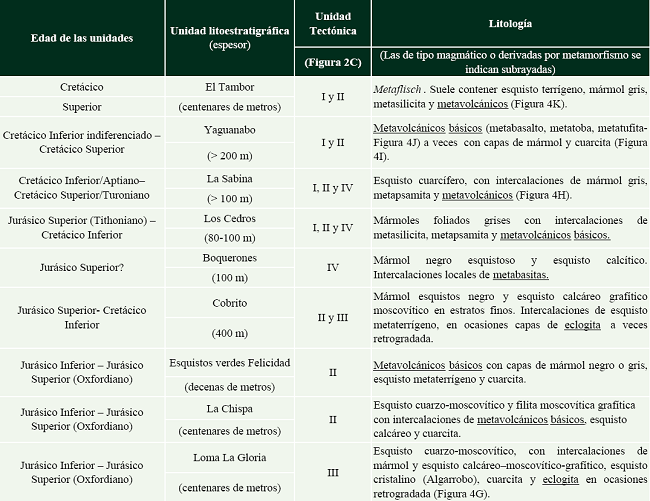 En el Terreno Escambray (Figuras 2C y 3), los cortes estratigráficos del Jurásico Inferior al Cretácico Superior muestran similitud estratigráfica con los reportados para la Cordillera de Guaniguanico y el Terreno Pinos (Millán y Somin 1985b; Dublan et al., 1986; Millán 1997a-c; Figura 3). Las secuencias originales se encuentran transformadas por el metamorfismo y la tectónica. El terreno cuenta con cuatro unidades tectónicas mayores que, aunque comparten algunas formaciones estratigráficas, muestran condiciones metamórficas distintas (Figura 3; e.g. , Stanik et al., 1981; Dublan et al. , 1986; Millán, 1995, 1997a-c, Despaigne-Díaz, 2009, y referencias allí contenidas). Además, debido a la complejidad tectónica del terreno, no existe información precisa de los espesores de algunas de estas formaciones. La unidad I incluye las siguientes formaciones: Llamagua (siliciclástica), Grupo San Juan (carbonatada), Los Cedros (carbonatada-silícea; Stanik et al. , 1981, reportaron microfauna del Tithoniano-Cretácico Inferior en unos sedimentos que posteriormente fueron atribuidos a esta Formación), Loma Quivicán (carbonatada-silícea), La Sabina (carbonatada-siliciclástica), Yaguanabo (vulcanógeno-carbonatada-siliciclástica) y El Tambor (metaflyshoide ). En la unidad I existe evidencia de metamorfismo en facies de esquistos verdes. La unidad II (metamorfizada en facies de esquistos azules) está integrada por las formaciones La Chispa (siliciclástica), Grupo San Juan, Cobrito (carbonatada), Los Cedros, Loma Quivicán, La Sabina y El Tambor. Intercalados con la Formación La Chispa se encuentran los Esquistos Verdes Felicidad (esencialmente con metavulcanitas). Por su parte, la unidad III se conforma sólo por la Formación Loma La Gloria (siliciclástica), en la que se intercalan los Esquistos Algarrobo y la Formación Cobrito. Se han reportado facies metamórficas de esquistos azules y eclogita para esta unidad (Millán 1997a-c; Dublan et al. , 1986; Schneider et al., 2004; García-Casco et al., 2006; Stanek et al., 2006). Finalmente, las formaciones Herradura (siliciclástica), Boquerones (carbonatada), Los Cedros y La Sabina integran la unidad IV, que se metamorfizaron en una facies de esquistos verdes. El metamorfismo observado en el Terreno Escambray está relacionado a la inserción del complejo en una zona de subducción (Millán 1997a-c; Dublan et al. , 1986; Stanek et al. , 2006; García-Casco et al. , 2006, 2008; Despaigne-Díaz, 2009; Despaigne-Díaz et al. , 2016).