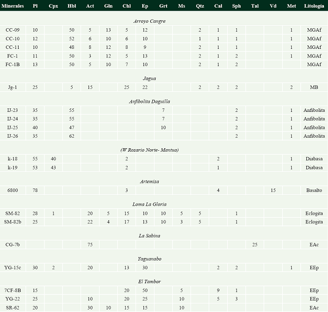 De todo este corte estratigráfico, las rocas meta-ígneas aparecen vinculadas a las formaciones La Chispa, Loma La Gloria, Boquerones, Cobrito, Los Cedros, La Sabina, Yaguanabo y El Tambor, así como en los Esquistos Verdes Felicidad (Tabla 3; Figura 3; Millán y Somin, 1985b; Dublan et al., 1986).