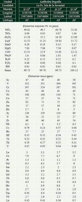 Dentro de la secuencia meta-sedimentaria jurásica del MCP en la Isla de la Juventud se ha reportado la presencia de rocas anfibolíticas (Tabla 2): (a) formando una escama tectónica independiente (Anfibolita Daguilla, Jurásico Medio-Jurásico Superior/Oxfordiano?), intercalada con mármol y esquisto cuarzo-feldespático (paquetes de ~100 m), al SE de La Fe (Millán, 1975; González, 2013; Figura 2B) y representa una destacada elevación (Loma Daguilla) en la región, ya que alcanza una altura de hasta 185 m sobre una planicie de escasos metros de altura sobre el nivel del mar, y (b) un cuerpo intercalado en estratos de mármol y cuarcita de la Formación Sierra de Caballos (Jurásico Superior - Cretácico Inferior; Figura 3), al SE de la ciudad de Nueva Gerona (Millán, 1997b). Las anfibolitas de la Isla de la Juventud se componen de hornblenda, plagioclasa (oligoclasa-andesina), magnetita, esfena, clinopiroxeno y granate (Tabla 4; Figura 4F; Millán, 1981).