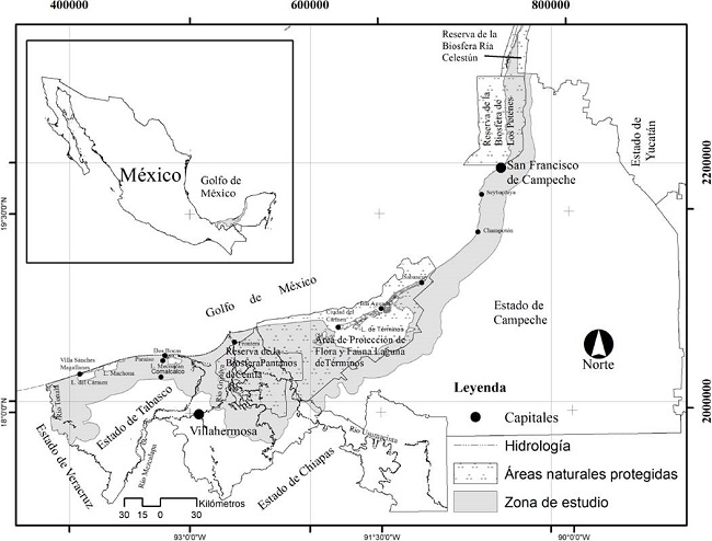 La zona costera del estado de Tabasco y Campeche se localiza entre los 17°15' y 20° 51' de latitud Norte, y los 89° 06' y 94° 17' de longitud Oeste, cubriendo una superficie de 22322.3 km2 en la costa sur del Golfo de México (Figura 1). Esta porción costera se reporta como Litoral Sur-Oriental (Tabasco hasta Laguna de Términos en Campeche), Litoral Occidental y Norte de la Península de Yucatán (de Isla Aguada en Campeche hasta Yucatán) (De la Lanza et al., 2013).