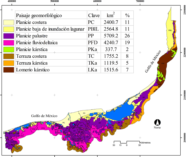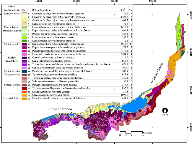 El 67 % de la superficie de la zona costera de Tabasco y Campeche tiene paisajes geomorfológicos integrados por relieves planos a cóncavos con escasa altura y pendiente, donde prevalecen sedimentos no consolidados fluviales, litorales, palustres y lagunares acumulados en el Cuaternario Holoceno (Figura 3); estas geoformas concuerdan con las reportadas en zonas costeras de topografía plana (Ortiz-Pérez et al., 2005; Geissert-Kientz y Enríquez-Fernández, 2011; IPCC, 2012; Addo, 2013; Bautista et al., 2015; Zavala-Cruz et al., 2016).