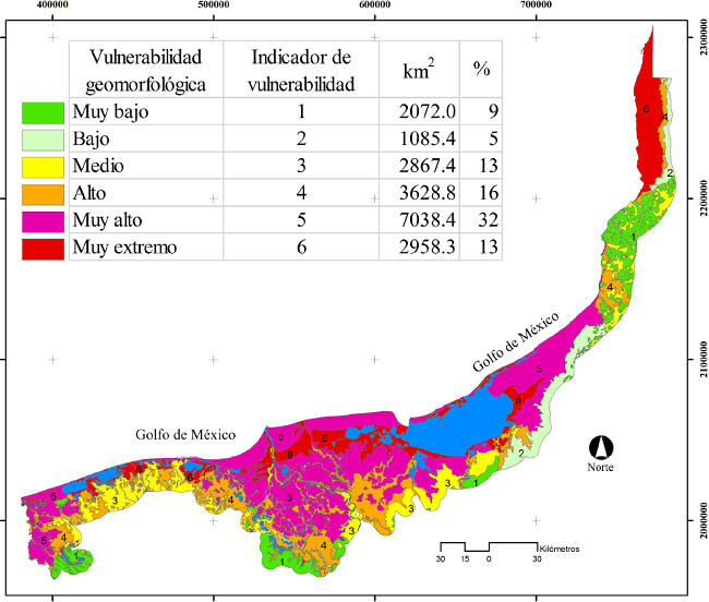 En esta etapa se aplicaron los indicadores de vulnerabilidad geomorfológica (Tabla 1) para conocer la vulnerabilidad de la zona costera de Tabasco y Campeche ante la inundación por el ascenso del nivel del mar debido al cambio climático, considerando un incremento del nivel del mar que puede variar de 59 cm (IPCC, 2007) a más de un metro para el año 2100, asociado a un deshielo glaciar más rápido por un mayor incremento de temperatura (Rahmstorf, 2012). El análisis de la vulnerabilidad geomorfológica se basó en los mapas de paisajes geomorfológicos, relieve/modelado y en la información morfométrica generada para la zona de estudio. El mapa de vulnerabilidad costera se diseñó mediante interpolación y análisis geográfico con un software especializado, utilizando versiones actualizadas de información geográfica de ARC GIS, ERDAS IMAGINE y QGIS.