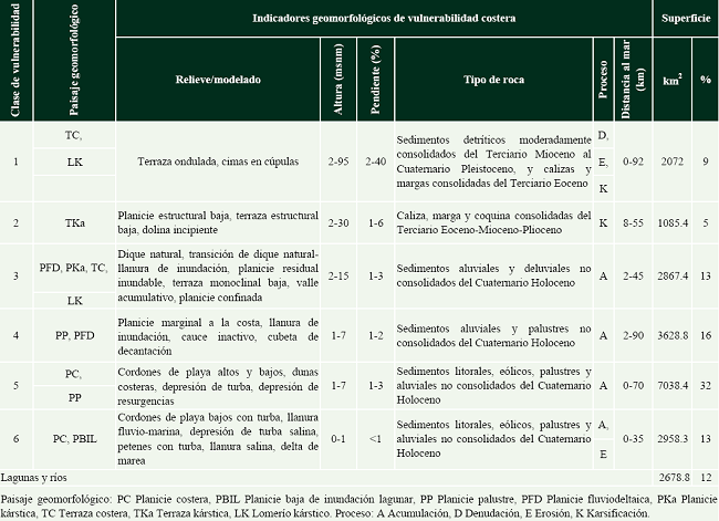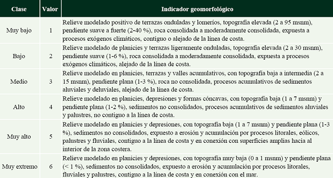 Los paisajes geomorfológicos costeros son la base fundamental para cuantificar la vulnerabilidad de los ambientes (Torresan et al., 2012; Addo, 2013), utilizando indicadores como la erosión, facilitando la cuantificación de impactos y estrategias implementadas para reducirla y mitigarla (Palacio-Aponte, 2010). Ayudan a visualizar cambios e identificar aspectos que requieren mayor atención (Buch y Turcios, 2003), focalizar las zonas con muy baja a muy alta vulnerabilidad (Thieler y Hammer, 1999; Ojeda et al ., 2009; Marcominii y López, 2010), y brindar atención a sitios que resulten focos rojos y prevenir posibles impactos. El tipo de relieve es uno de los indicadores geomorfológicos que contribuye a estructurar el nivel de vulnerabilidad (Buch y Turcios, 2003) y es de utilidad como antecedente para la elaboración de instrumentos de regulación del territorio (Pikelj y Juracic, 2013). En Europa los estudios de vulnerabilidad costera son usados para coadyuvar a la planificación espacial terrestre y marina (Liquete et al., 2013).