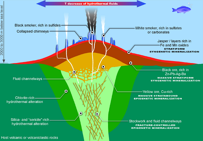 Mineral parageneses are a key for the definition of physicochemical parameters that characterize the conditions for mineral precipitation, including timing. Mineralization in submarine magmatic-hydrothermal systems is a product of the chemical and thermal exchange between the ocean, the lithosphere, and the magmas emplaced within it. Different mineral associations precipitate during the typical stages of mineralization that characterize the life span of such systems. For comprehensive reviews of this subject see Franklin et al. (1981, 2005), Lydon (1988), Ohmoto (1996), Barrie and Hannington (1999), Hannington et al. (2005). Minerals present in a hydrothermal system or a fossil VMS deposit are deposited passively or reactively. Mineral associations may vary (1) in different mineralized structures, either syngenetic (namely, passive precipitation in chimneys, mounds and stratiform deposits) or epigenetic (structures that correspond to feeder channels, and replacements of host rocks or pre-existing massive sulfide bodies), or structural zonation , (2) from proximal to distal associations with respect to venting areas within the same stratigraphic horizon , or horizontal zonation, (3) from deep to shallow associations (i.e. , stockworks to mounds), or vertical zonation , (4) from early and climactic to late stages of mineralization (dominated by sulfides, and sulfates or oxides, respectively), or temporal zonation , and (5) in various volcano sedimentary contexts, depending essentially on the composition of volcanic rocks and, ultimately, on the tectonomagmatic context. The most common minerals in ore-bearing associations of VMS deposits (non-metamorphosed or oxidized) and their modern analogues are pyrite, pyrrhotite, chalcopyrite, covellite, sphalerite, galena, tetrahedrite-tennantite, marcasite, realgar, orpiment, proustite-pyrargyrite, wurtzite, stannite (sulfides), Mn oxides, cassiterite, magnetite, hematite (oxides), barite, anhydrite (sulfates), calcite, siderite (carbonates) quartz and native gold, and are differently distributed in the various associations schematized above. The most common hydrothermal alteration assemblages are chloritic (including Mg-rich ones) and phyllic (dominated by "sericite", mostly illite), and also silicification, deep and shallow talcose alteration, and ferruginous (including Fe oxides, carbonates and sulfides) alteration.