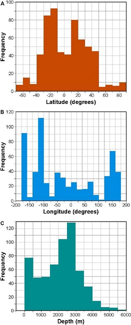 The global frequency distribution of depths for the occurrence of actualistic examples of VMS deposits (magmatic-hydrothermal seafloor vents, either black or white smokers) shows a dominant range between 2000 and 3000 m (Figure 3; also, Figures 2 and 3 in Hannington et al., 2005), which is consistent with calculated depths of fossil examples (see Table 1 and references therein). In spite of this, much shallower examples are known both in present-day manifestations (Figure 3) as well as in fossil VMS deposits (e.g. , Camprubí et al., 2017). Their global frequency distributions in latitude and longitude, however, are not expected to be clear because such spatial variables do not govern any geological characteristics for the location of venting. In fact, the present-day convergent or divergent margins that are capable of sustaining hydrothermal manifestations analogous to VMS deposits (see Figure 1 in Hannington et al. , 2005) can be found in a wide variety of latitudes and longitudes, including divergent margins within the Arctic Circle and the convergent margin adjacent to the Antarctic Peninsula. However, the latitudinal distribution of those vents shows a bimodal pattern between 40°N and 40°S (Figure 2), which includes different types of both convergent and divergent margins (see Figure 1 in Hannington et al. , 2005). The distribution is deemed to be an artifact due to the difficulties of carrying out oceanographic campaigns in extremely low latitudes, either north or south, in comparison with peri-equatorial regions.