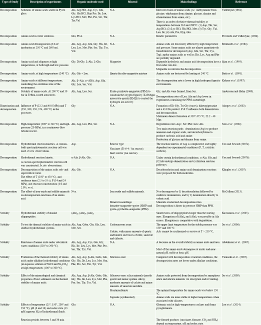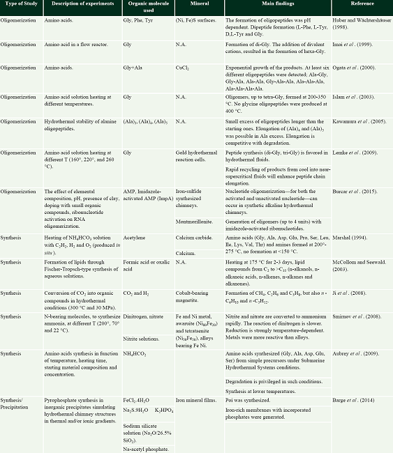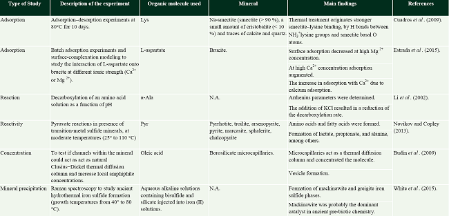 Experiments related to (1) the adsorption of organic molecules onto minerals, those related to explore the possible role of mineral channels in the concentration, and (2) the reactivity of some organics in hydrothermal vents are still scarce (Table 4).