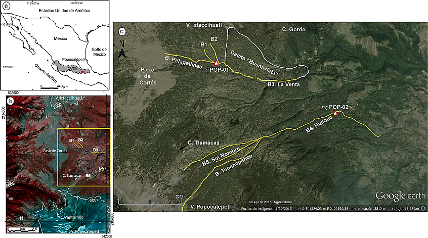 El volcán Popocatépetl se localiza en el extremo sur de la Sierra Nevada, cordillera volcánica de edad Plio-Cuaternaria situada en el sector centro-oriente del Cinturón Volcánico Transmexicano (CVTM) (Figura 1a). La composición geoquímica de sus productos es dacítico-andesítica (Schaaf et al., 2005).