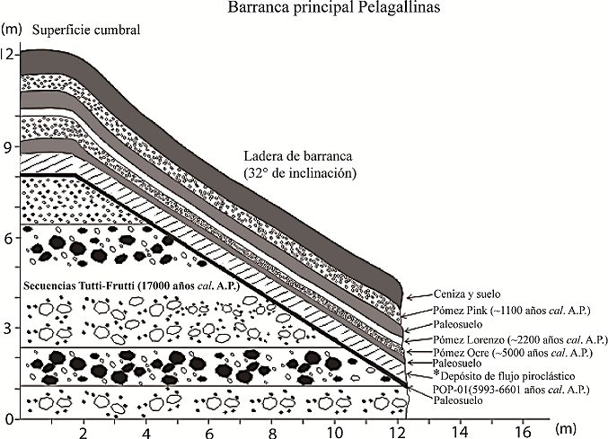 La presencia de un paleosuelo sobre la secuencia de pómez Lorenzo indica un periodo de calma eruptiva, que terminó con el depósito de la capa de pómez de caída de la erupción de ~1100 años cal. A.P. (Siebe et al., 1997). Cabe mencionar que sobre las laderas de la barranca, a pesar de su fuerte pendiente (32°), las pómez de caída de 5600 - 5900 y ~1100 años cal. A.P. forman capas continuas con espesores menores que en las superficies de poca inclinación fuera de la barranca (Figura 2). Lo anterior indica que la formación y desarrollo de esta barranca y otros similares ocurrió en una etapa de inestabilidad geomorfológica post-Tutti-Frutti, entre ~17000 y ~6000 años cal. A.P. La fecha POP-01 de 5993 - 6601 cal. A.P. (5515 ± 125/-120 años 14C A.P.) representa el inicio de la estabilización de las laderas de la barranca principal Pelagallinas, ya que sobreyace directamente al primer suelo formado en la ladera de la barranca. Los eventos plinianos posteriores mantearon la barranca, que ya se encontraba estabilizada. En otras palabras, en los últimos ~6000 años cal. A.P. las laderas de la barranca prácticamente no han estado activas, como indica la presencia de las pómez Pink y Ocre in situ en laderas con pendiente de > 30°. En las laderas de ésta y las barrancas afluentes, la estratigrafía es similar a la de la Figura 2, sin embargo los espesores varían y ocasionalmente falta alguna capa (por ejemplo la pómez Lorenzo, que es muy delgada en esa zona).